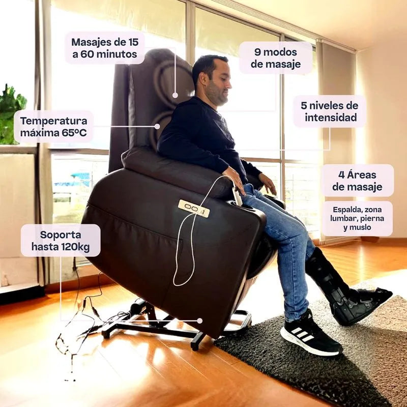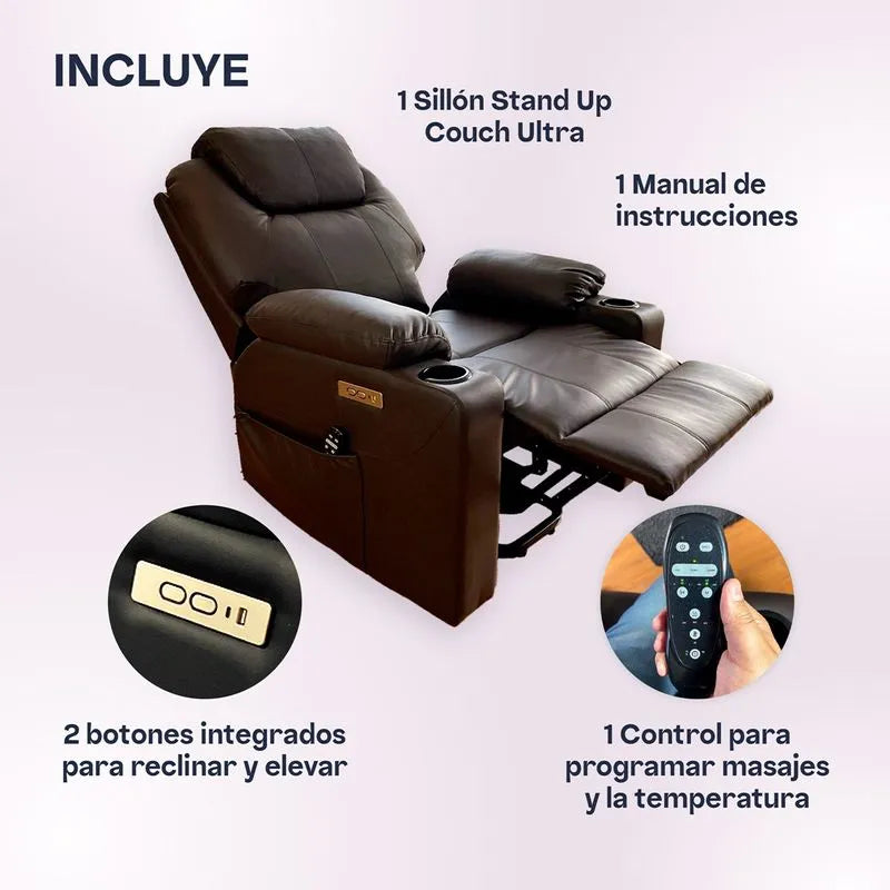 Es cómodo y fácil de usar, te ayuda a levantarte de forma segura y facilita el ponerse de pie para aquellas personas que requieran soporte en esta actividad. • Su diseño ofrece un masaje vibratorio con calor, donde podrás escoger el nivel de intensidad y temperatura según tu necesidad, generando una sensación de relajamiento y confort. • Podrás seleccionar el modo y la intensidad según lo requieras obteniendo ese confort que buscas. • El Stand Up Couch Ultra puede ayudar con la reducción del estrés y obtener un buen descanso ya que puede elegir diferentes inclinaciones de su respaldar contribuyendo a la relajación y, en consecuencia, a liberar el posible estrés acumulado de la rutina del día. • Cuenta con un panel de control manual para función de elevación de silla y reclinación, también tiene entrada de puerto USB y salida tipo C, que le permite mantener sus dispositivos cargando, como casi todos los teléfonos inteligentes (como iOS, Android...), tabletas, auriculares, etc.