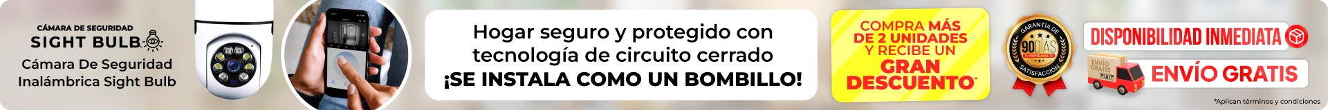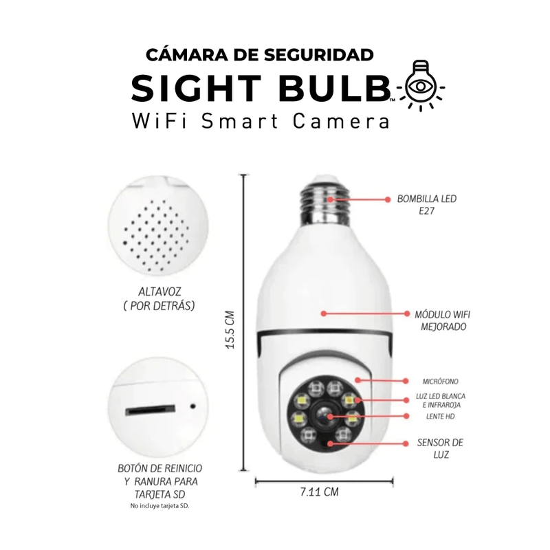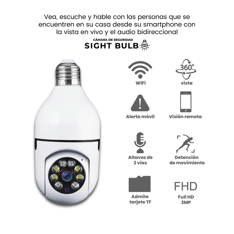 Es una cámara robótica de seguridad que manejarás desde tu celular o tableta y la podrás hacer rotar 360° para ver hacia cualquier dirección. • Cuenta con tecnología de acción, ya que se activa al detectar movimiento y lo sigue; además viene con micrófono bidireccional que te permite mantener una conversación, todo en tiempo real. • Es una excelente manera de tener vigilancia, disuadir ladrones, monitorear tu hogar, los niños, el automóvil, o las mascotas, sintiéndote seguro y protegido. • No se requieren baterías, ya que la Sight Bulb es alimentada por cualquier foco de luz estándar, incluso con los de iluminación empotrada y se conecta fácilmente al wifi de la casa. • Monitorea tu casa con la cámara de seguridad Sight Bulb desde tu movil, donde registrara lo que capte al activarse gracias a sus sensores de movimiento o cuando esté siendo monitoreada desde la app. • La Sight Bulb sigue el movimiento en toda dirección 360º para ver lo que está pasando y permite hablar por el micrófono bidireccional. • Sight Bulb te permite grabar en la noche, gracias a su tecnología de visión nocturna por infrarrojo. • Con la Sight Bulb se reduce la probabilidad de robo y puedes estar tranquilo sabiendo que tu propiedad y tu familia están siendo protegidos. • Es fácil de instalar como un bombillo, sin cable de alimentación, ni perforaciones, luego de instalada, descarga la aplicación para configurar la cámara en unos minutos. • Puedes ver videos de monitoreo en vivo en tu Smartphone, compatible con iOS, Android, tableta, iPad y sistema Windows IE. • Con la cámara inalambrica Sight Bulb, puedes elegir guardar videos en una tarjeta micro SD (No incluida).