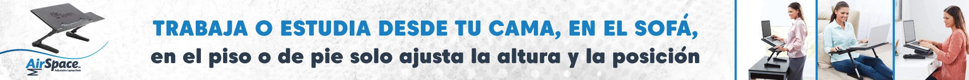 Podrás trabajar o estudiar desde tu cama, en el sofá, en el piso, solamente ajustando la altura y la posición del Air Space Desk. • Al ser ajustable, te ayudará a evitar las molestias musculares por trabajar en posiciones prolongadas. • Podrás trabajar sentado o de pie cómodamente, y hacer estiramientos cuando lo necesites. • Podrás darle un descanso a los músculos de la espalda por trabajar tanto tiempo sentado sin tener que interrumpir tus actividades en el computador portátil. • Podrás usarla de manera versátil, ya que se convertirá en una mesa adecuada para comer, leer, dibujar, y/o escribir. • Podrás trabajar en casi cualquier dispositivo, celular, Tablet, computador portátil. • Podrás usar la repisa lateral para usar el mouse o incluso para colocar tu bebida preferida. • Evitará el recalentamiento de tu dispositivo, ya que tiene un ventilador que ayuda a refrigerarlo. • Se dobla para guardarlo y queda completamente plano. • Es imprescindible si trabajas de forma remota o vas a la oficina. Y es perfecto para estudiantes y artistas digitales, que a menudo se limitan a sentarse en un escritorio durante largos períodos de tiempo.