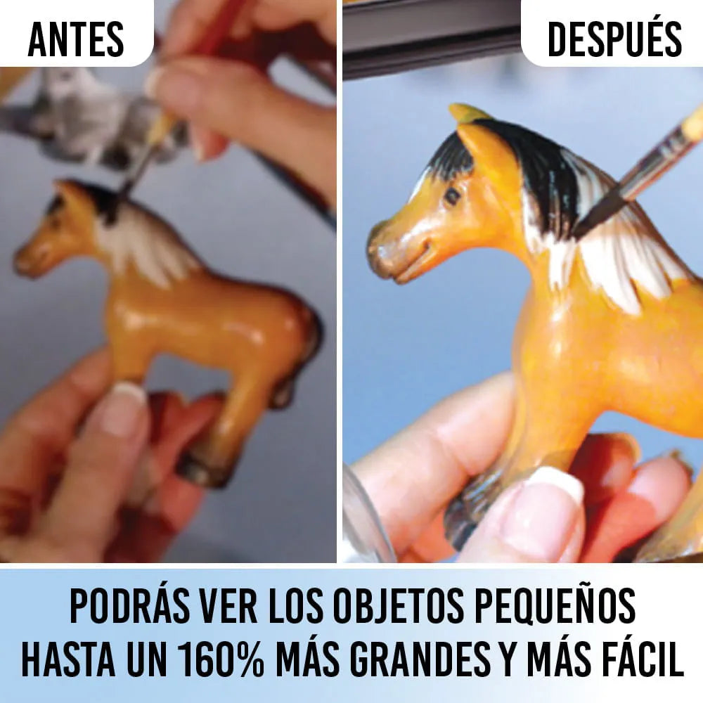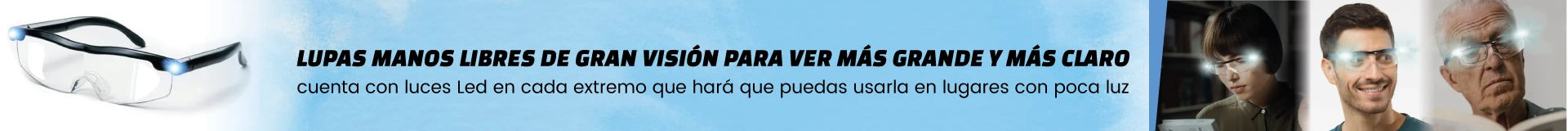 Permite que pueda ver los objetos pequeños más grandes y más fácil • Las luces Led le permitirán incluso usarlas en lugares de poca luz. • Le ayudarán a ahorrar dinero ya que son recargables y no tendrá que comprar pilas. • Permite mantener las manos libres para realizar una tarea completa. • Por su aumento de hasta un 160%, permite que sea más fácil enhebrar, leer, dibujar, escribir, realizar manualidades y más. • Se pueden usar sobre gafas formuladas o lentes de contacto. • Por ser una lupa, no requiere examen de la vista o prescripción. • Marcos flexibles, ligeros, unisex.