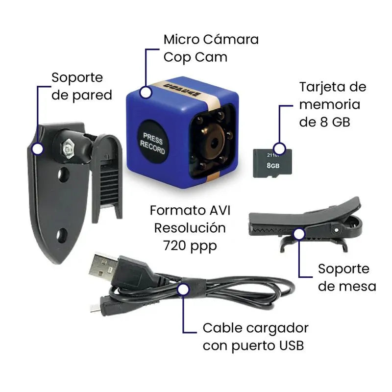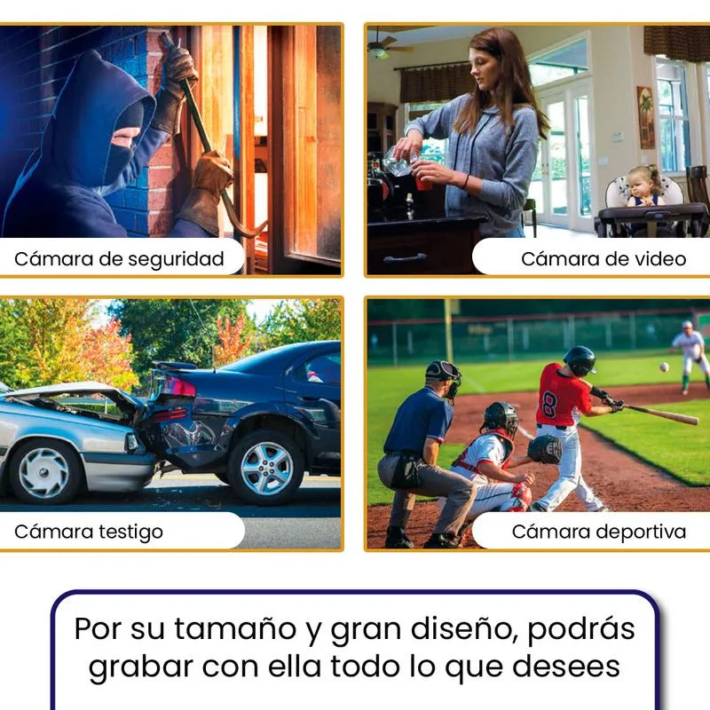 Podrá grabar con esta cámara lo que pasa con sus seres queridos e incluso a sus pertenencias. • Es pequeña por lo tanto es discreta ante las personas. • Es portátil, ya que tiene un soporte que permite que se lleve incluso en la ropa. • Por su tamaño y gran diseño, podrá grabar con ella todo lo que usted desee, utilízala como cámara de seguridad, cámara deportiva, cámara personal, cámara testigo, o simplemente como una cámara de vídeo. • Tiene sensor de movimiento, permitiéndole grabar solo cuando detecta movimiento, es decir graba lo que usted quiere ver. • Tiene micrófono integrado, por lo tanto no solo podrá ver si no escuchar lo que pasa mientras usted no está.