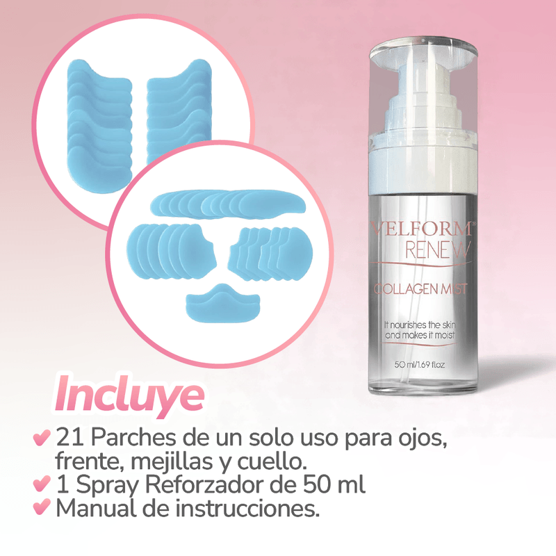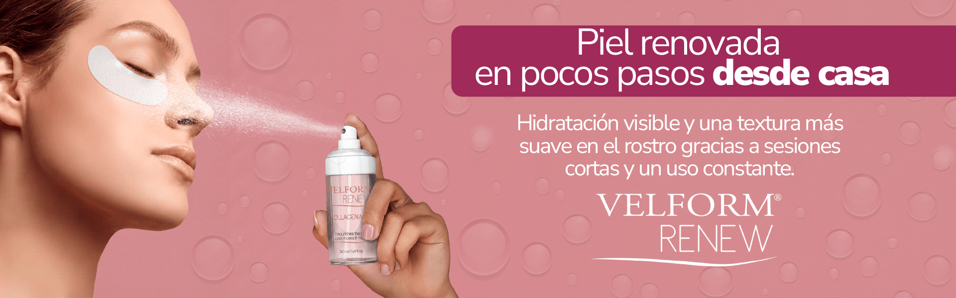 Velform Renew es un tratamiento facial por zonas que combina parches hidratantes con un spray reforzador formulado con colágeno y ácido hialurónico. Este sistema ayuda a aportar una apariencia más firme, hidratada y luminosa en sesiones cortas, suavizando líneas de expresión y mejorando el tono y textura de la piel. Su formato por zonas permite enfocarse en ojos, frente, mejillas y cuello, integrándose fácilmente a la rutina de belleza en casa.