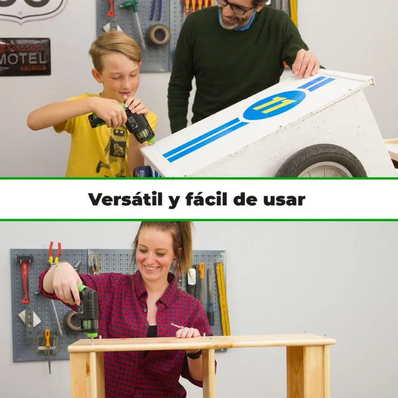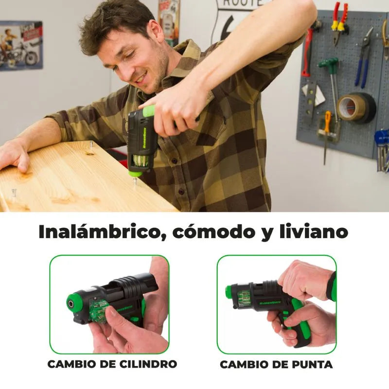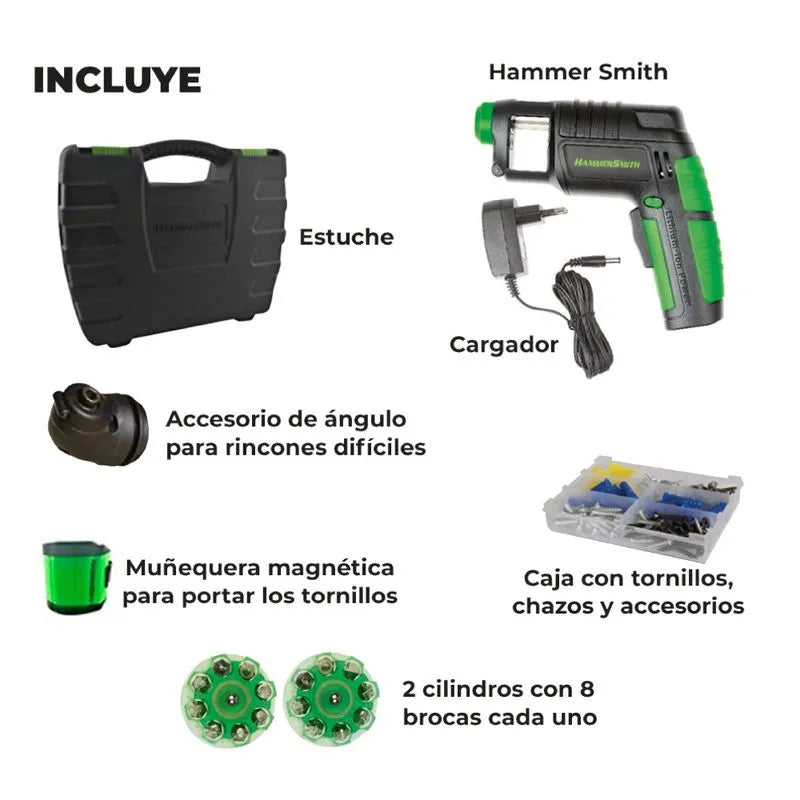 HammerSmith es una innovadora herramienta que funciona como taladro o destornillador, perforando sobre diferentes materiales y marcando o trabajando sobre distintos cabezales de tornillos. Este instrumento funciona como una pistola de dos tambores, cada uno cargado con 8 accesorios o cabezales que se intercambian rodando el tambor. Es una herramienta fabulosa, práctica y muy útil para realizar diversos trabajos en el hogar.