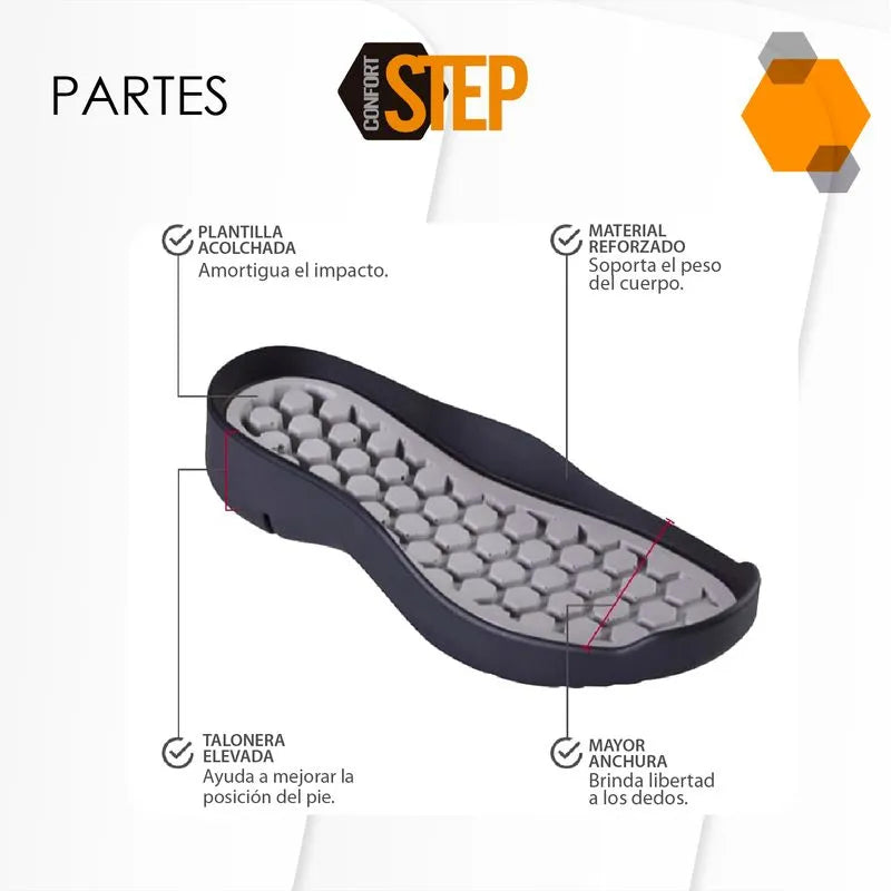Confort Step va más allá de la moda y la comodidad. Te brinda seguridad y estabilidad en cada paso. En diferentes superficies, su suela antiderrapante te otorga un agarre firme, mientras que su tecnología antifatiga se convierte en un masaje revitalizante, incluso en tus días más largos. Internamente, la plantilla única redefine la experiencia de calzado. Una talonera elevada que soporta levente tus pies, mientras que hexágonos internos y una capa exterior de memory foam abrazan tus pies con una combinación perfecta de flexibilidad y estabilidad. Su diseño ergonómico ayuda a protegerte contra molestias comunes en tus pies.